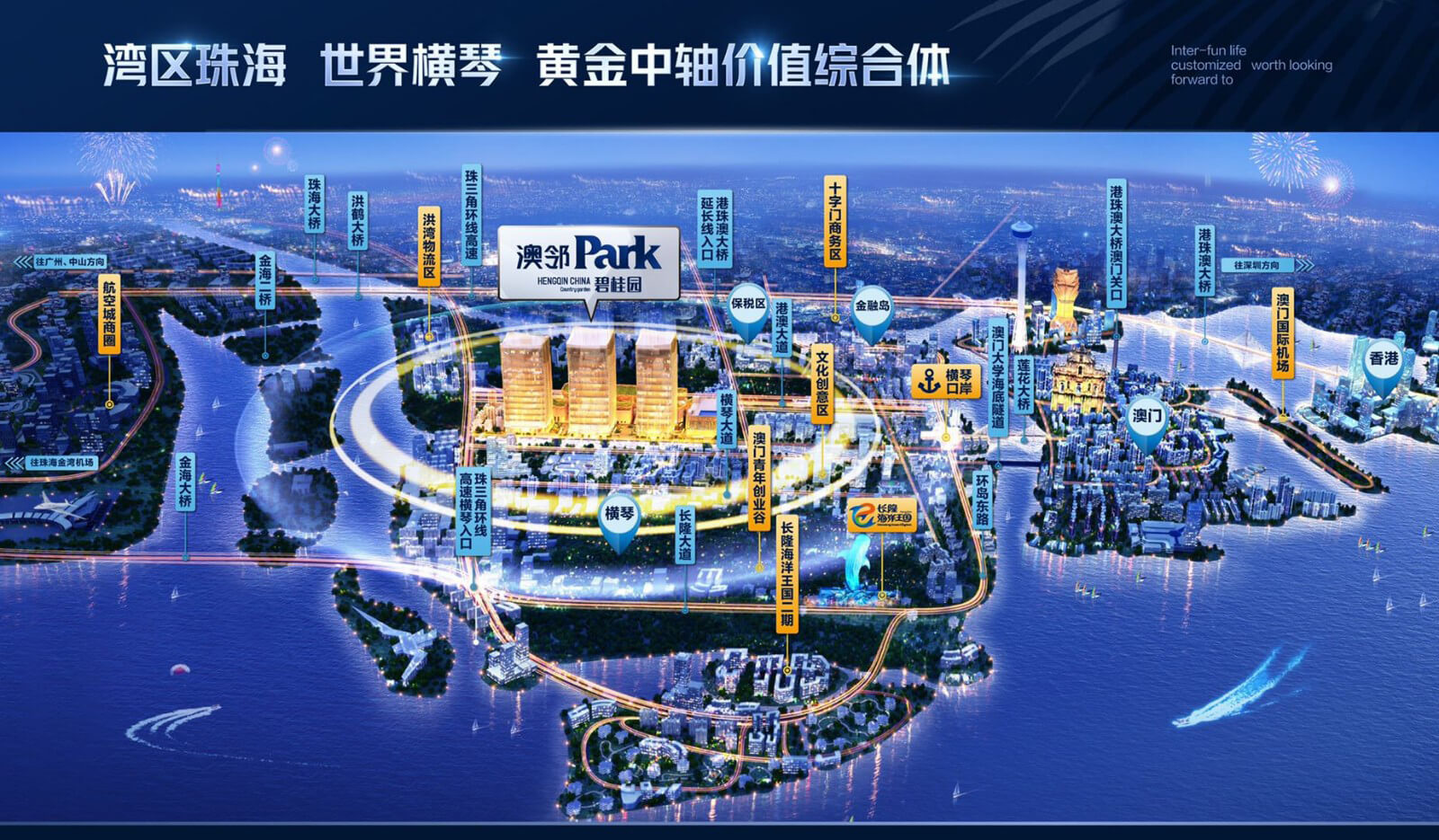 碧桂園·澳鄰park位於橫琴最核心的“科教研發片“,享受項目周邊“金融島和國際旅遊區”白領精英和旅遊人流帶動的經濟紅利,離岸金融、稅收及澳門單牌車政策利好!項目位處港澳大道城市黃金軸線、橫琴關口、長隆樂園黃金三角態勢,6000m達橫琴口岸,6000m達橫琴長隆海洋王國,未來預計享受關口8000萬通關人流及長隆5000萬遊客人流紅利。坐享世界橫琴,特區中特區的價值優勢!憑藉一步澳門地理優勢,勢必帶來價值爆發!