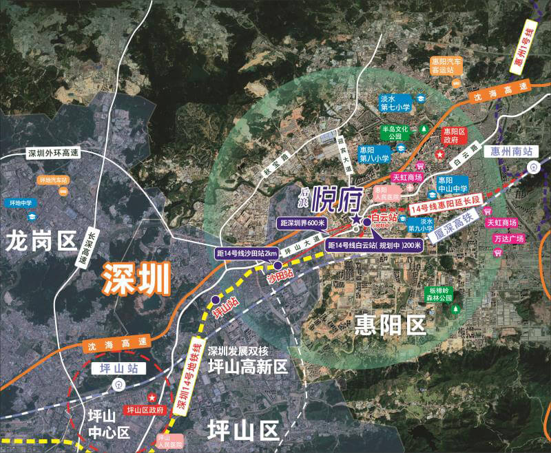 地鐵:距離深圳14號線地鐵線沙田站僅約2公里,距惠州延長段白雲站(規劃中)約200米,暢聯深圳地鐵網