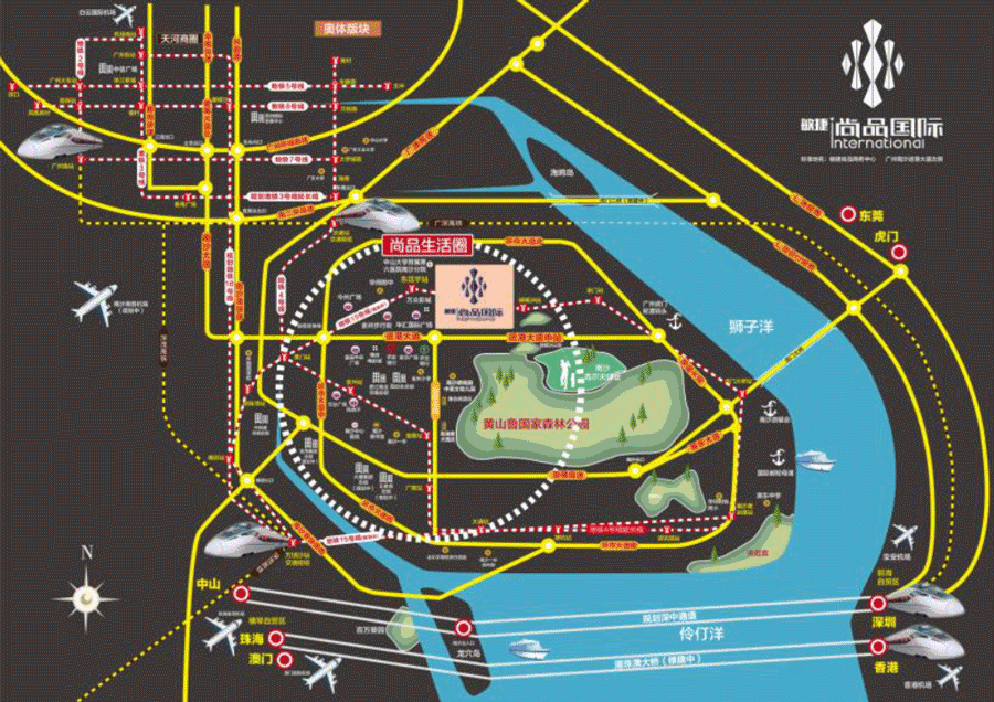 項目門口就有公交站(進港大道中站)有6條公交線路,基本通達整個南沙,到金洲地鐵站或蕉門地鐵站僅需5分鐘。