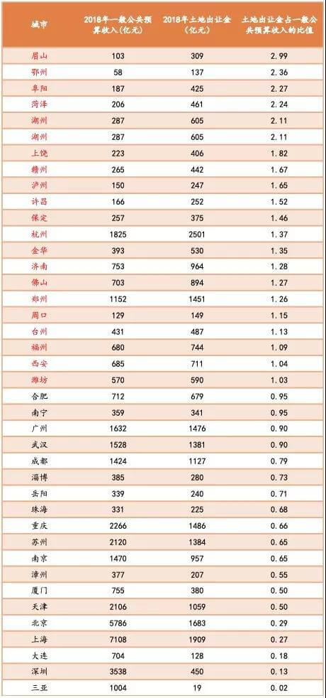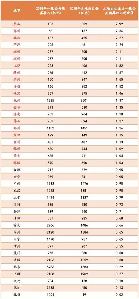 2018年40个重点城市中有20个城市土地出让金收入超过地方一般公共预算收入,“土地财政”依赖度相对较高。