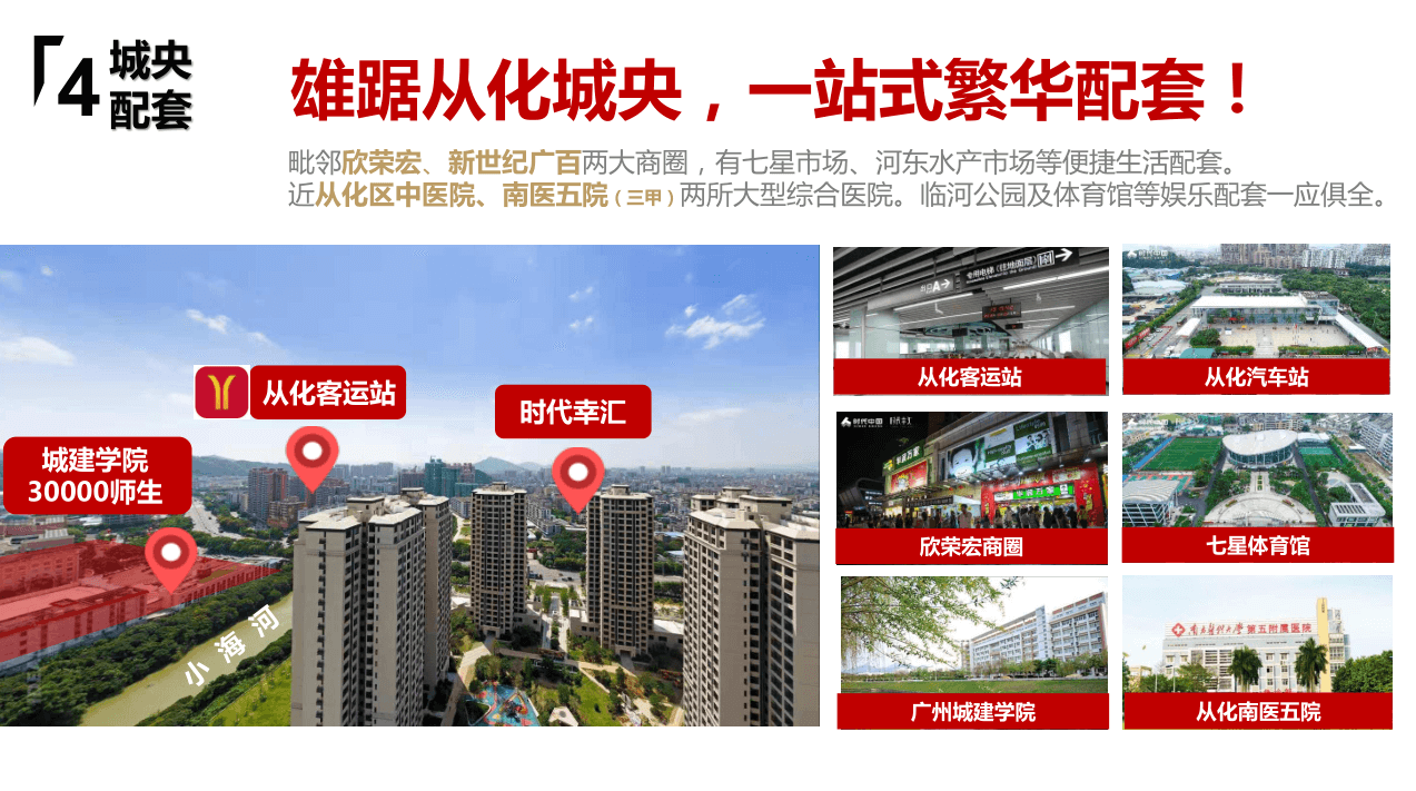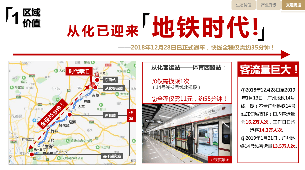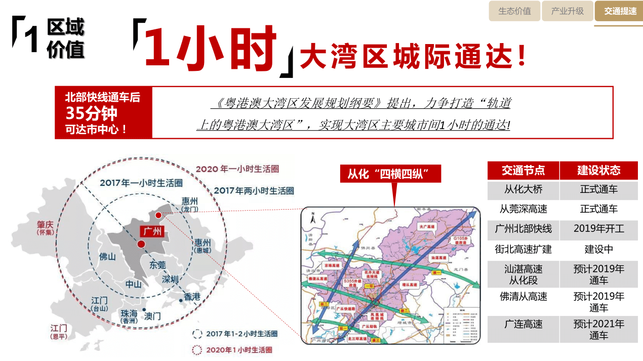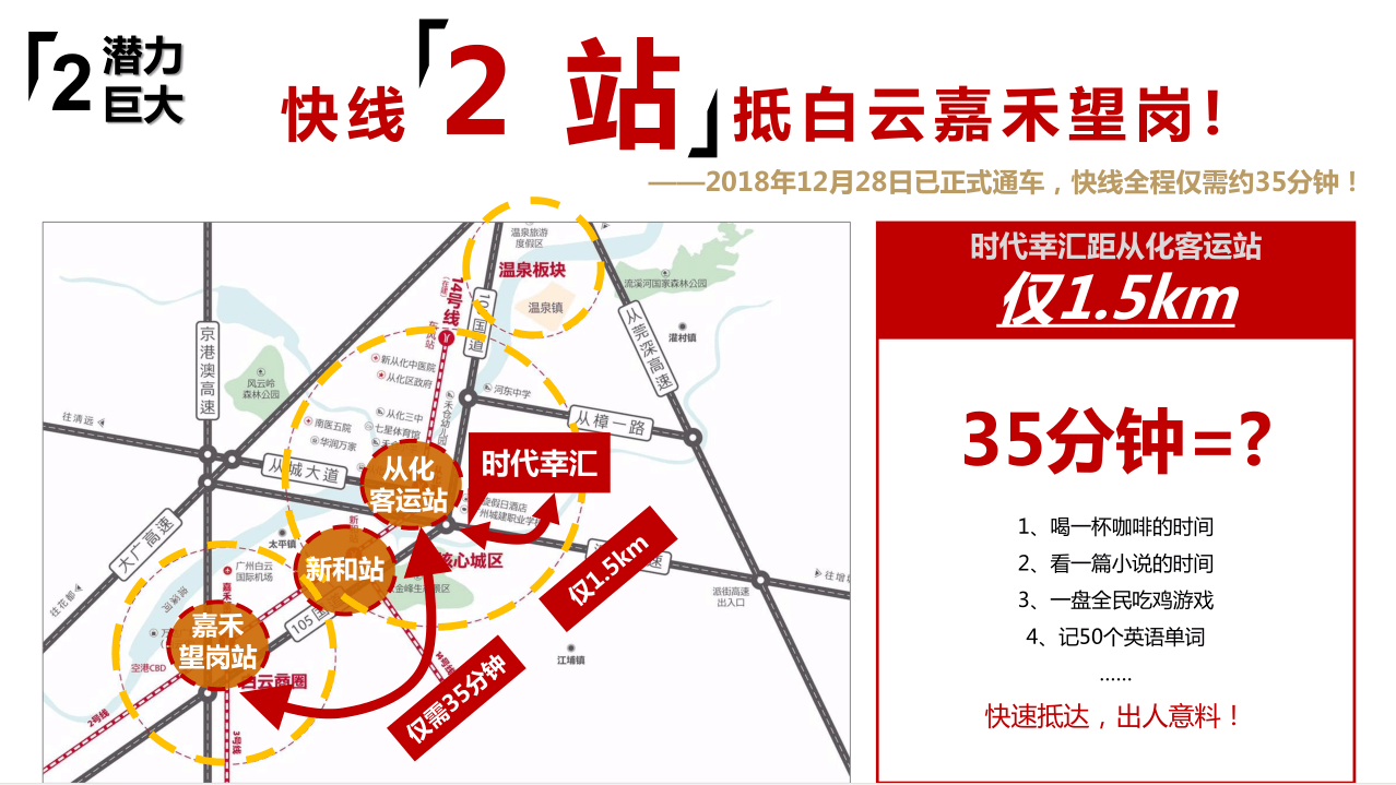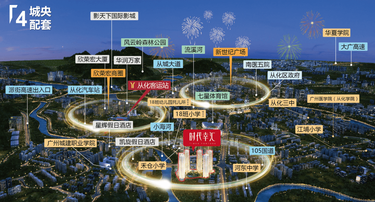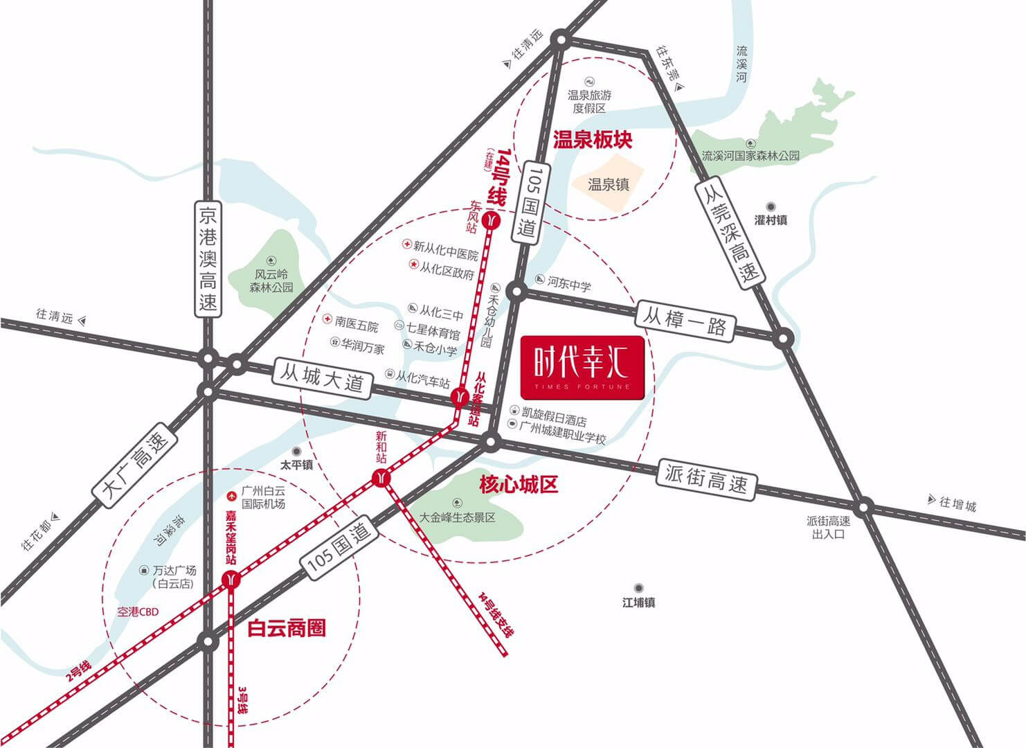 【交通】專案傲踞從化最繁華中心城區,距地鐵14號線從化客運站約1.5km,2站(快線)即達白雲區嘉禾望崗。距街北高速出入口僅2km,四大高速環繞,交通便捷。