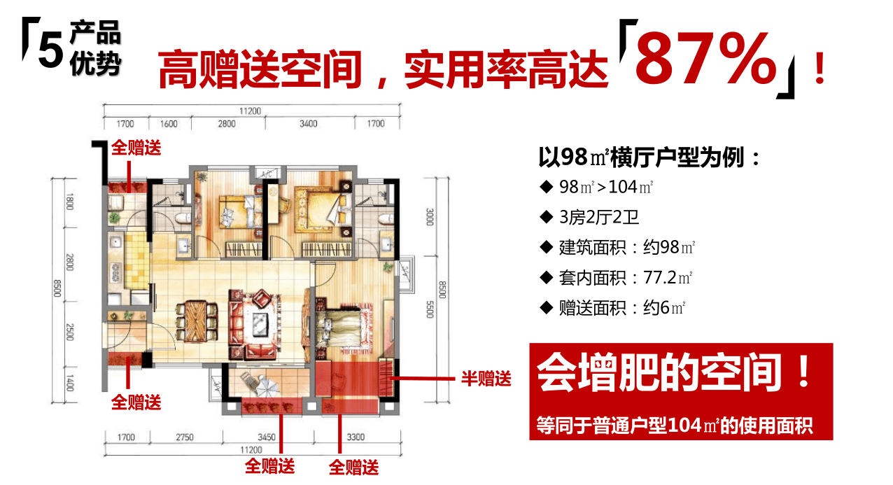 【產品】精裝修現樓,戶型實用率高達87%。98方三房相當於104方,戶型方正實用,奢闊舒適。精裝修現樓發售,裝修標準領跑從化。