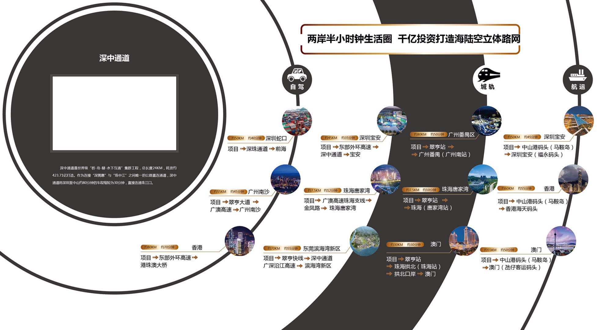 6、五機場:五機場是指香港國際機場、澳門國際機場、廣州白雲機場、珠海國際機場、深圳國際機場,90分鐘暢達周邊五大機場,接駁全球。