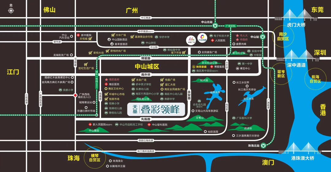 粵港澳大灣區公園城:中山規劃建設首個文旅小鎮,以十大公園群為核心,分別由金鐘湖公園、市兒童公園、氣象公園、樹木園等生態公園組成,本項目距離該片區不足1公里!