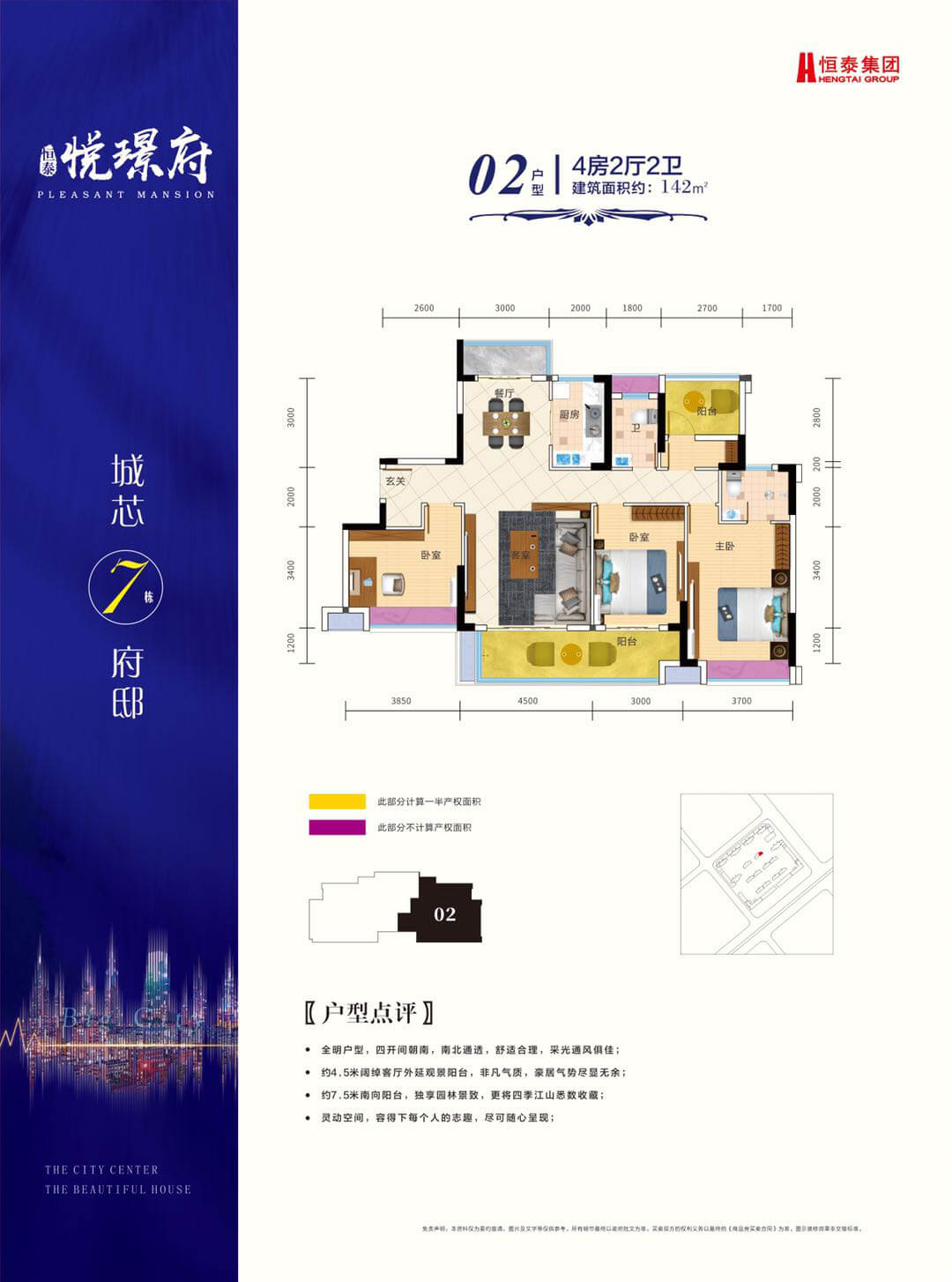【戶型產品】恒泰悅璟府標杆產品為板式低密洋房,126、136、139、142㎡四房戶型;7棟兩梯四戶,9棟一梯兩戶每家每戶均可享超大電梯廳。而且每個戶型均有一個可拓展為房間的陽臺,僅計算一半產權面積。超高實用率,7米寬陽臺,南北偏東朝向,享受更多日照時長。