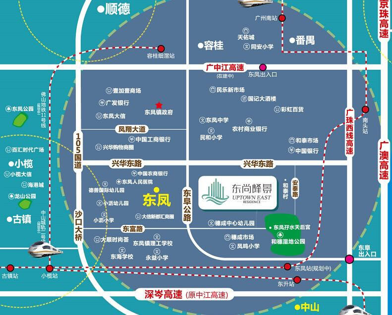 項目位於東鳳鎮,東鳳鎮北接順德容桂,南與經濟強鎮小欖鎮接壤。項目處於東鳳鎮核心地段興華東路,距順德容桂約3公里,距小欖鎮約1.5公里,交通發達,人頭湧湧人口密集!