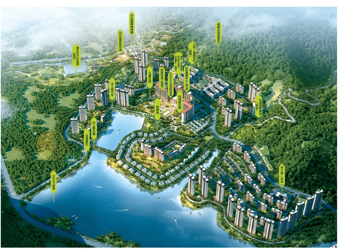 項目採用“因地制宜,創新融合”的設計理念,讓度假與自然融為一體,山湖林海,互為風景。前擁堪為國家一級優質水源的30萬平原生態湖泊-鏡湖;後靠萬畝黃巢山自然風景區,周邊森林覆蓋率高達90.4%,集瀑布、奇石、溪流等奇觀異景為一體。是為天然氧吧,爆表負氧離子12800個/m³,空氣品質蟬聯廣東省排名前3。