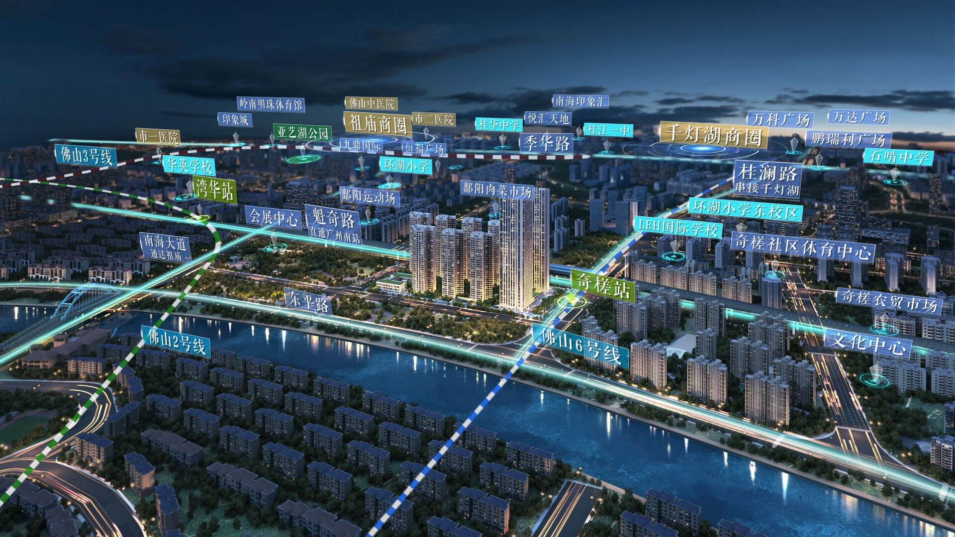 項目位於佛山核心發展黃金中軸上,臨近佛山第一主幹道「桂瀾路和魁奇路」,毗鄰地鐵2/6號線(規劃建設中),距廣州南站僅15分鐘車程,40 分鐘輕鬆回港。